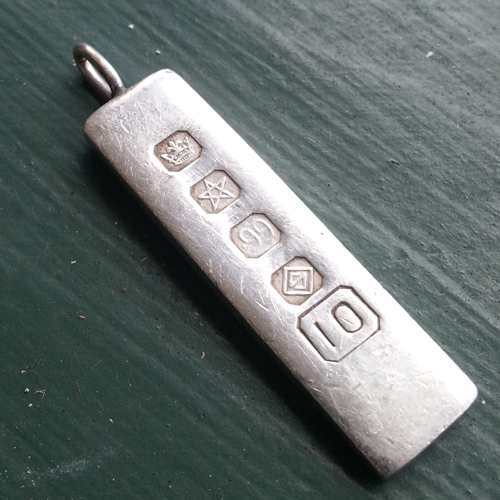 I recently came into possession of a (presumably) sterling silver ingot pendant by way of my late grandmother, I’ve so far had no luck identifying the markings on the back and my Grandfather can’t recall where it came from. It doesn’t appear to be too old, but I know my grandparents were very well traveled so I’m really just hoping to find out where it came from so I can jog my grandfathers memory a little.