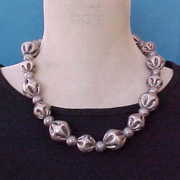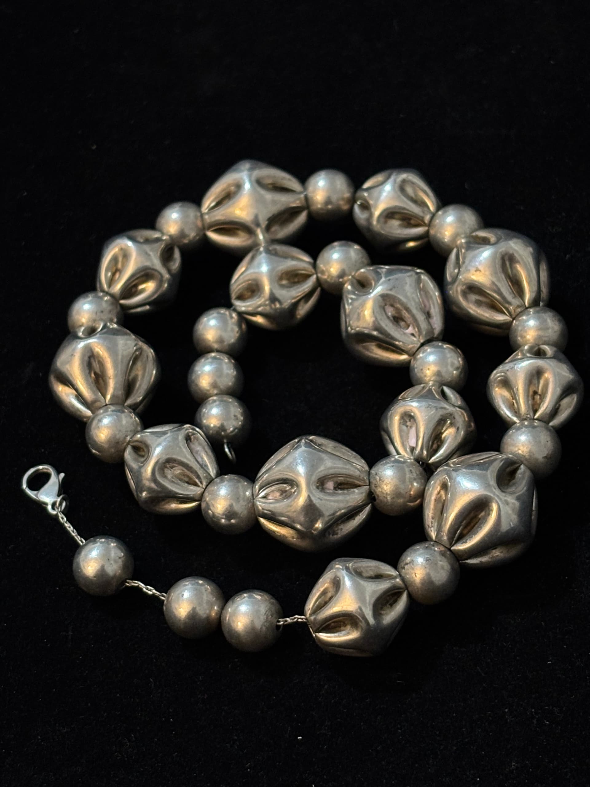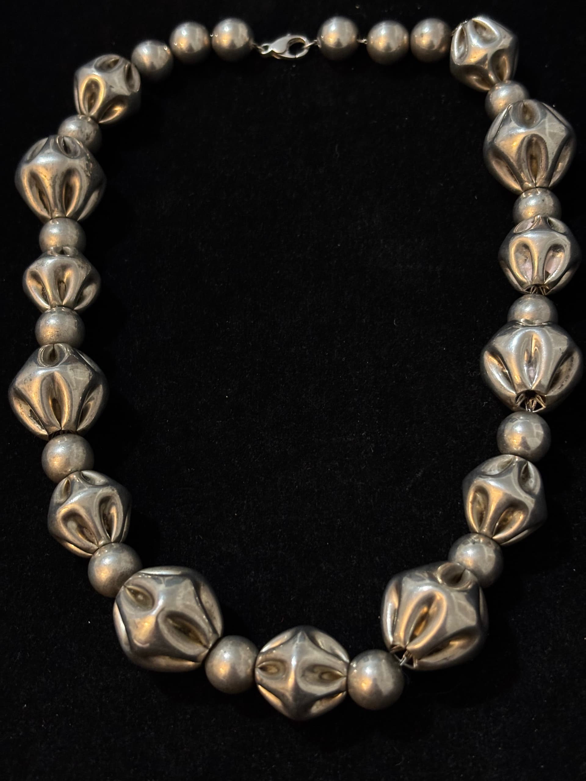 Hello, can someone please help me identify this necklace? I was told these were Navajo pearls by the seller, but my own research tells me they are not. Can anyone provide any info on these? They are stamped 925, but not signed by a maker or artist. They weigh just over 100 grams and test positive for Sterling. Any info would be greatly appreciated ![]()