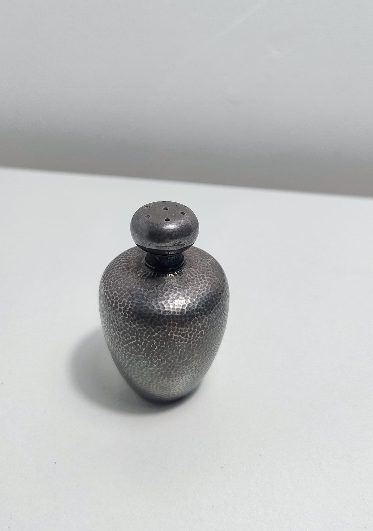 As to what it is; it is modern, probably about 1970’s and probably made for the Hong Kong export market. It’s half of a salt and pepper set, and presumably the top comes off to allow for the pepper in ground form to be inserted. This sort of item often originated from Guangdong, Fujian or other southern provinces in this period when a great deal of silver was sold to raise badly-needed liquidity. Unfortunately they were often melting down 19th century and earlier siver to make something the tourist or export market would move quickly.