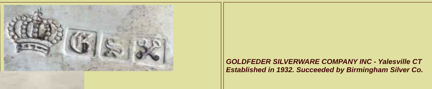 Hi, welcome to the world of silver marks. Yours are makers marks belonging to the U.S silverplate manufacturer, Goldfeder Silver Company of Yalesville, Connecticut. Cheers, Steve American Silverplate marks: marks and hallmarks of US makers: G