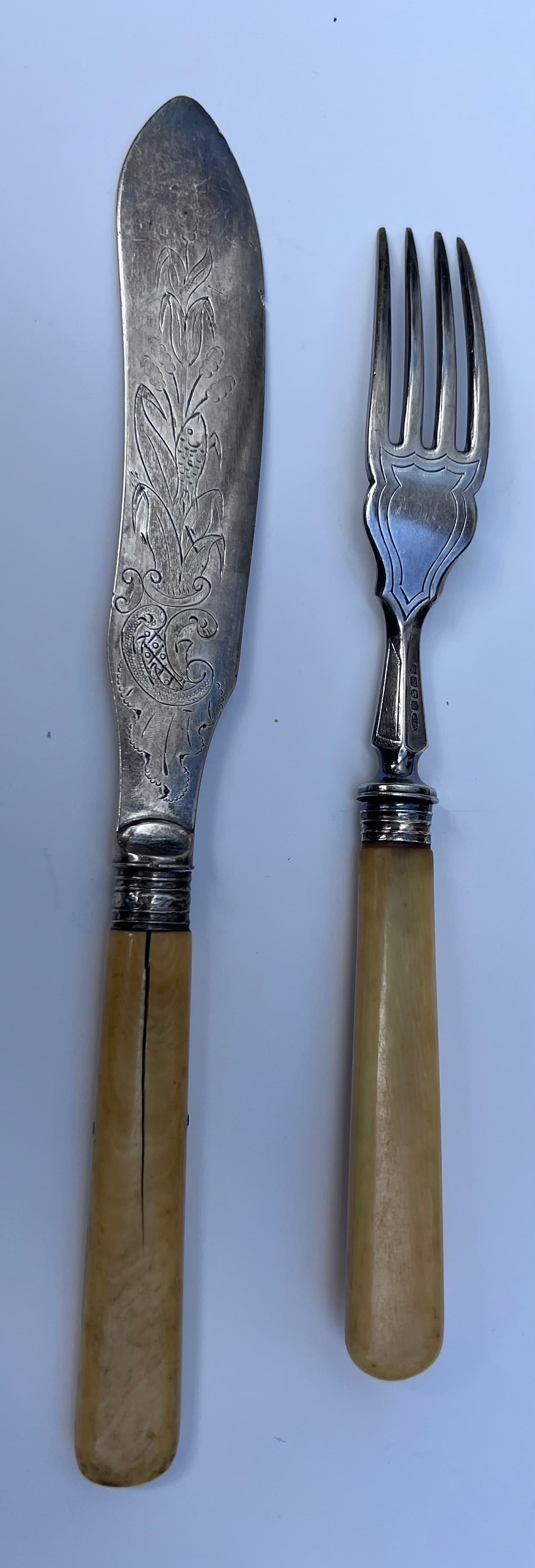 As to what they are. The decoration on the knife gives an excellent clue. It’s a FISH knife. As the fork is associated with it, you have a pair of fish knife and fork. Fish forks of this period typically have the waisted shape somewhere between the base of the tines and the handle. It looks as though you have two waist indents, which is a little unorthodox, but not unheard of. Knives sold singularly are often ‘mis-sold’ as butter knives. It’s good to see an honest pair of fish eating irons.