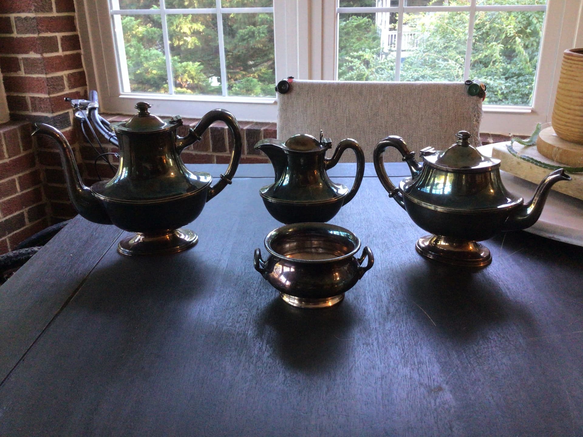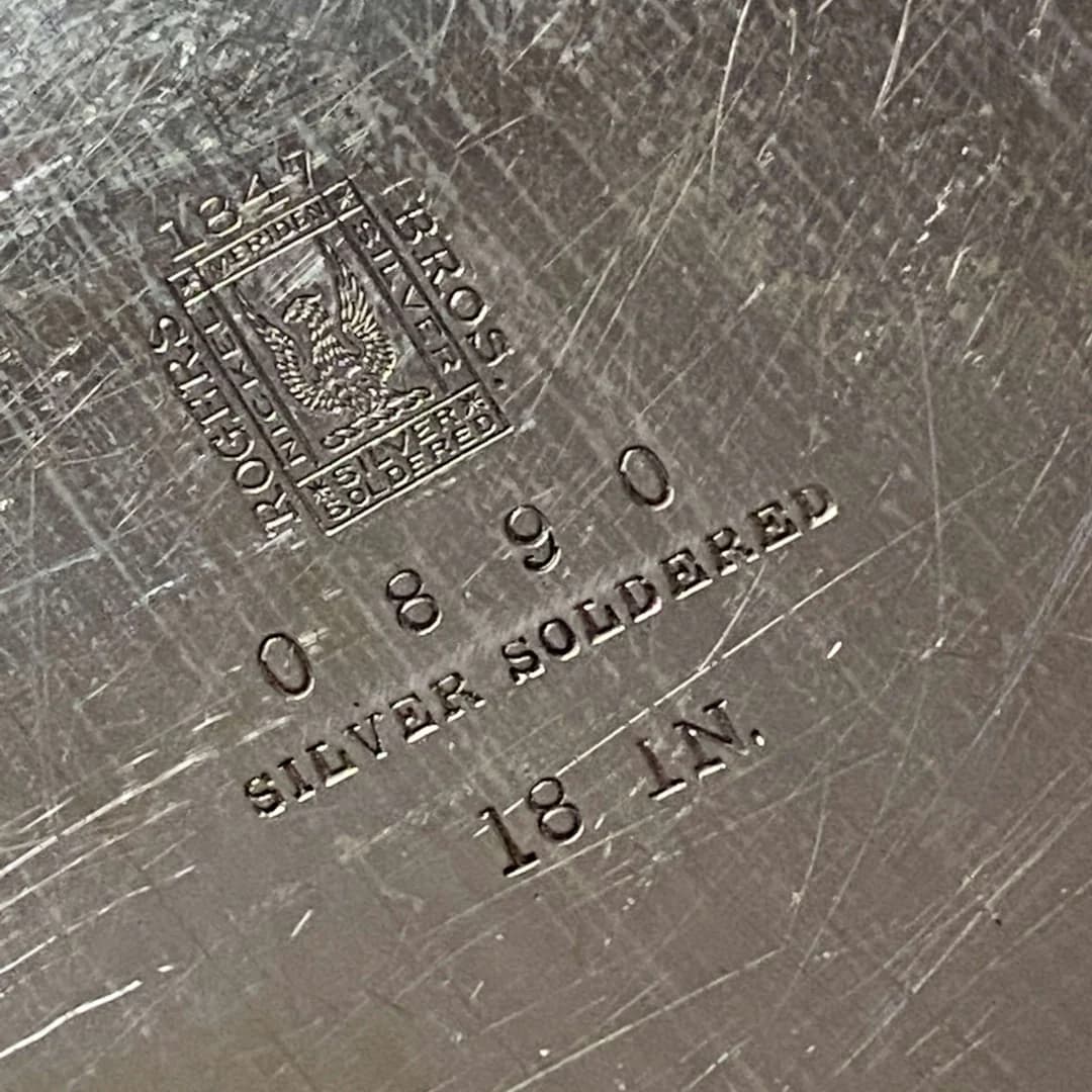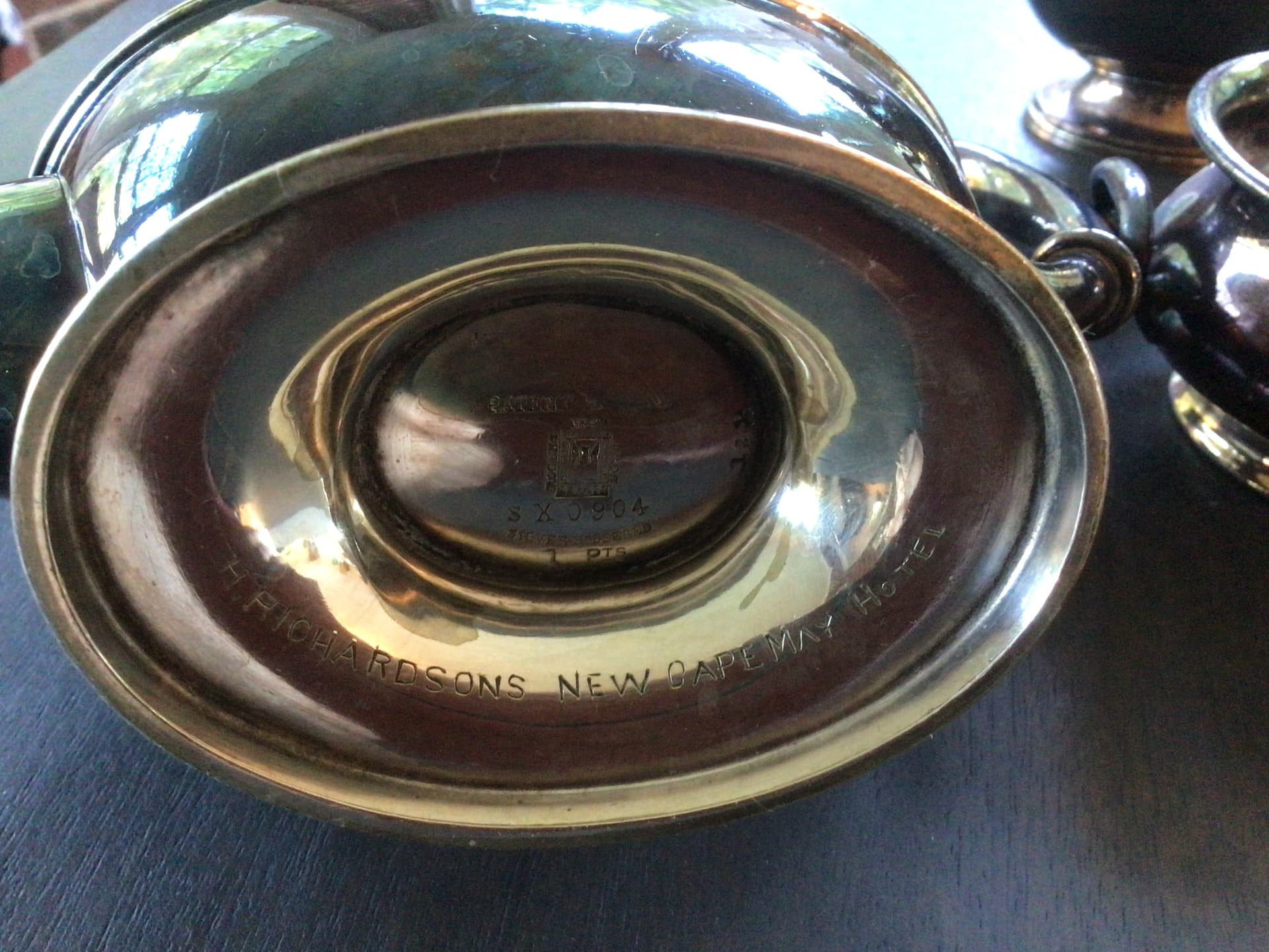 The pieces are silverplate, not sterling. Can’t quite make it out, but in the center of the bottom I see the phrases “Patented something” and “Silver Soldered,” which tells the tale. In short, this is fairly common hotel ware, worth very little. But better to land in a thrift shop than be destroyed.