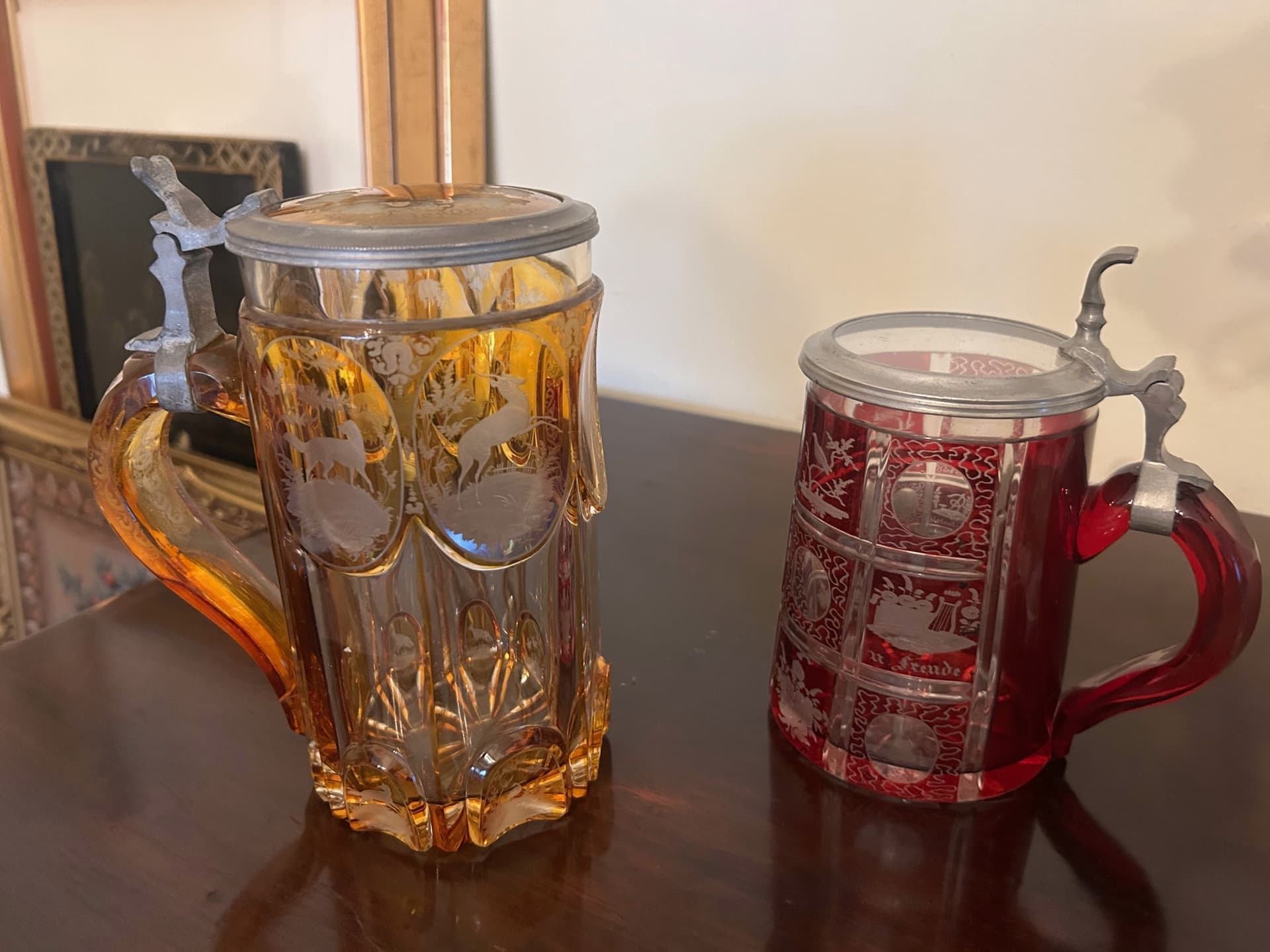 For now, both mugs are in Melbourne, at my father’s house. Their appearance suggests they are Bohemian glassware, dating from around 1860.