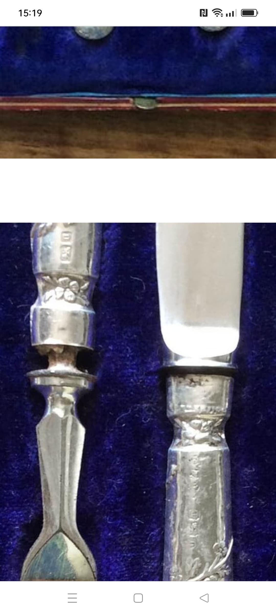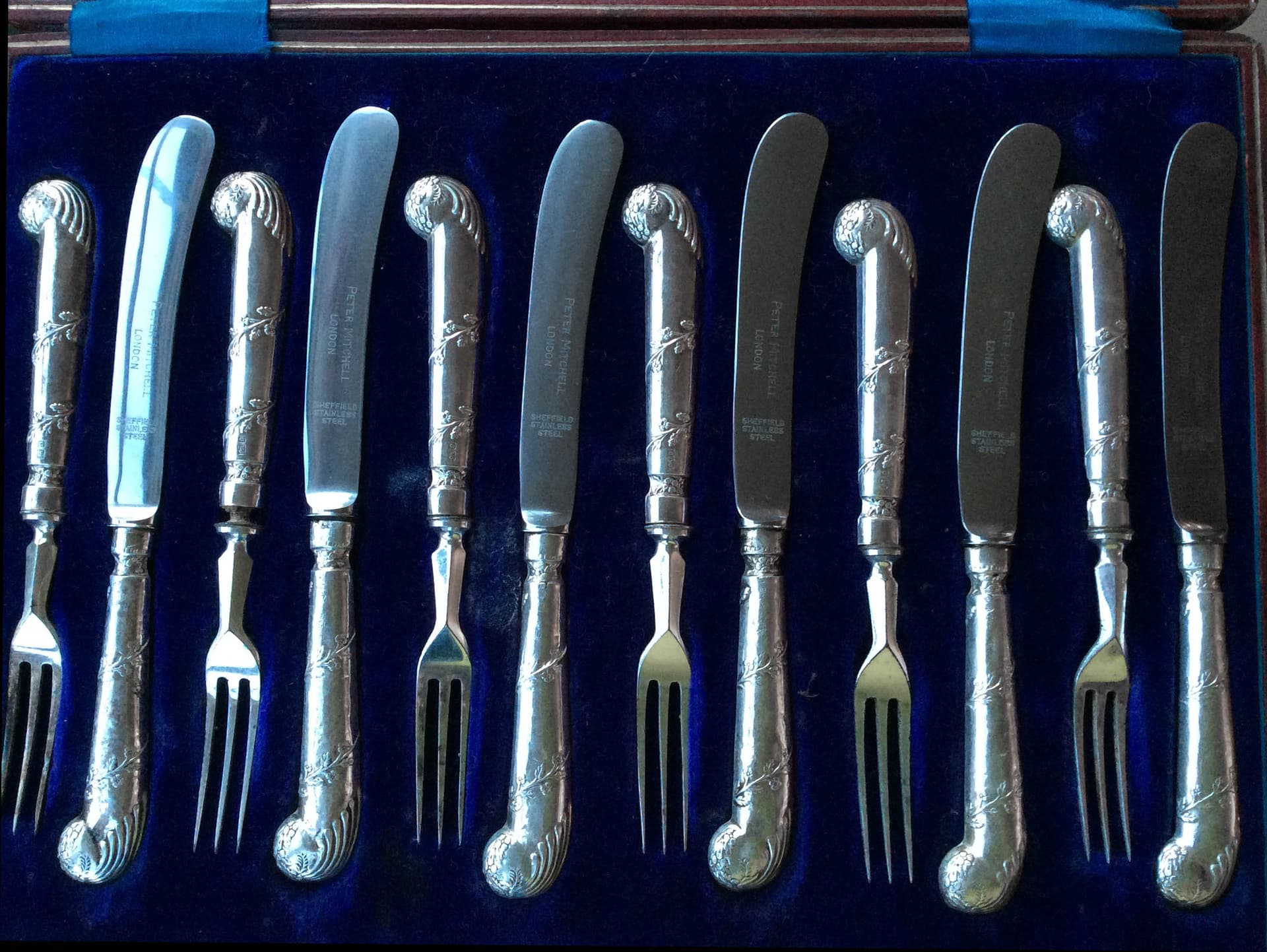 When I uploaded a photo to Google image search, the result was that usually the handles are sterling 92.5% silver while the blades are either silver plated or stainless steel. The knife blades in my set are clearly marked with the maker name Peter Mitchell and ‘Stainless Steel’.