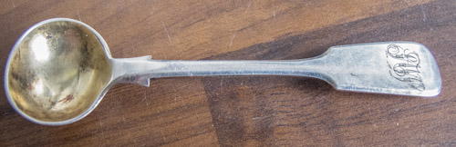 here are some photo’s at different angles. the spoon itself feels fairly heavy for it’s size, it has a deep ‘spoon’ part and some engraved initials/monogram that I can’t make out.