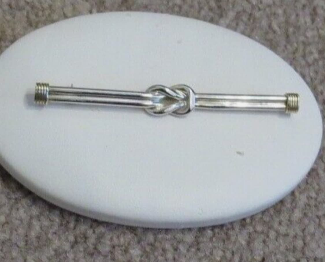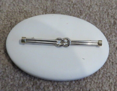 This appears to be a discontinued listing on ebay for a Tiffany & Co. Love Knot Bar Pin Brooch Sterling Silver 925 Gold 14K
