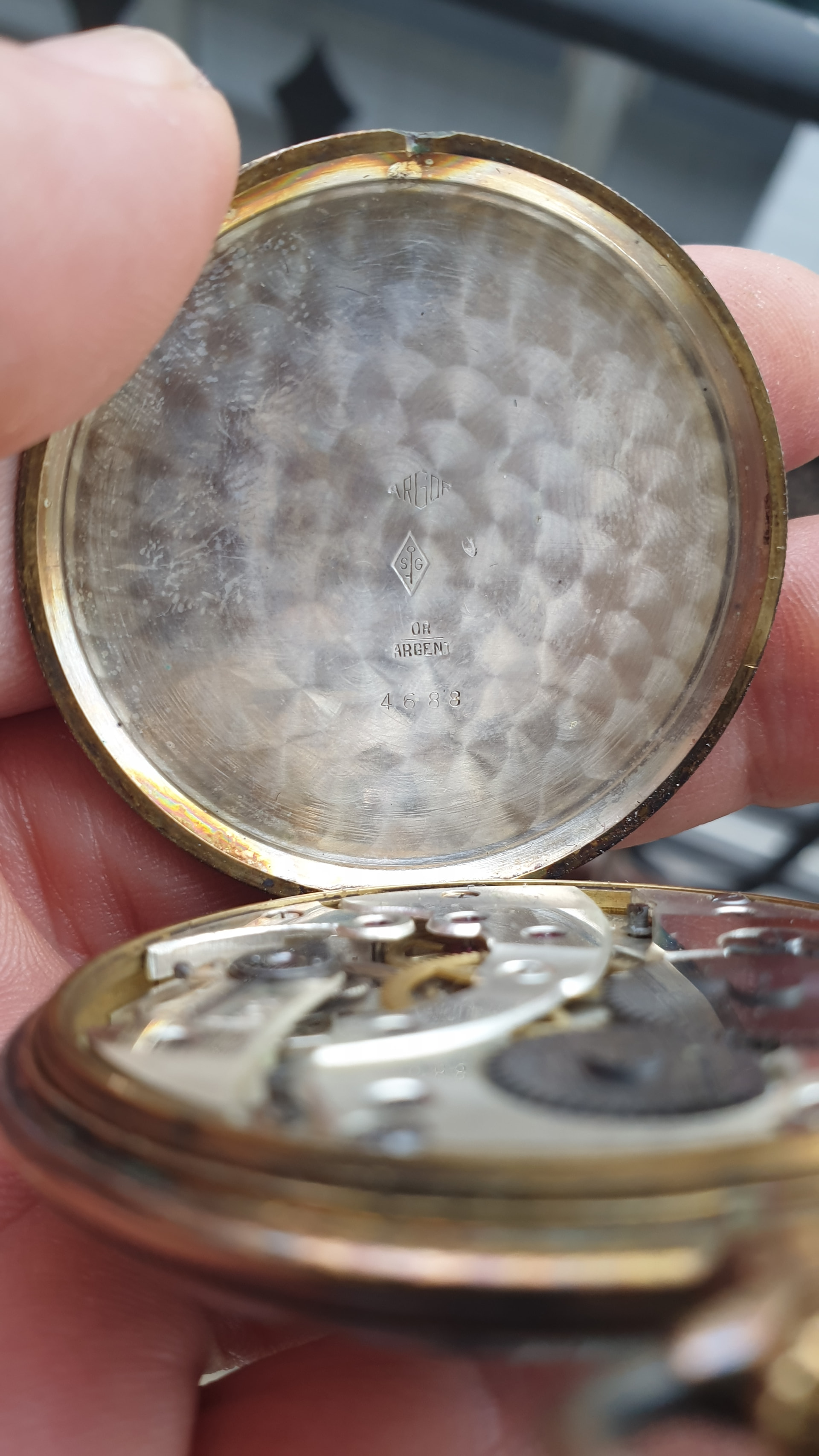 Hello, this is a silver and gold watch. It tests positive for 18k when you do an acid test but when you open it; .800 silver.