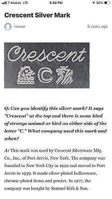 As Jools has told you, the Crescent Silverware Mfg. Co., Port Jervis, NY was founded in 1922 in New York City and moved to Port Jervis in 1939. It took over the old Knickerbocker Silver Company just before moving and was, in turn, bought out by Kirk-Stieff of Baltimore in 1977. They made about 450 items of silver-plate hollow ware.