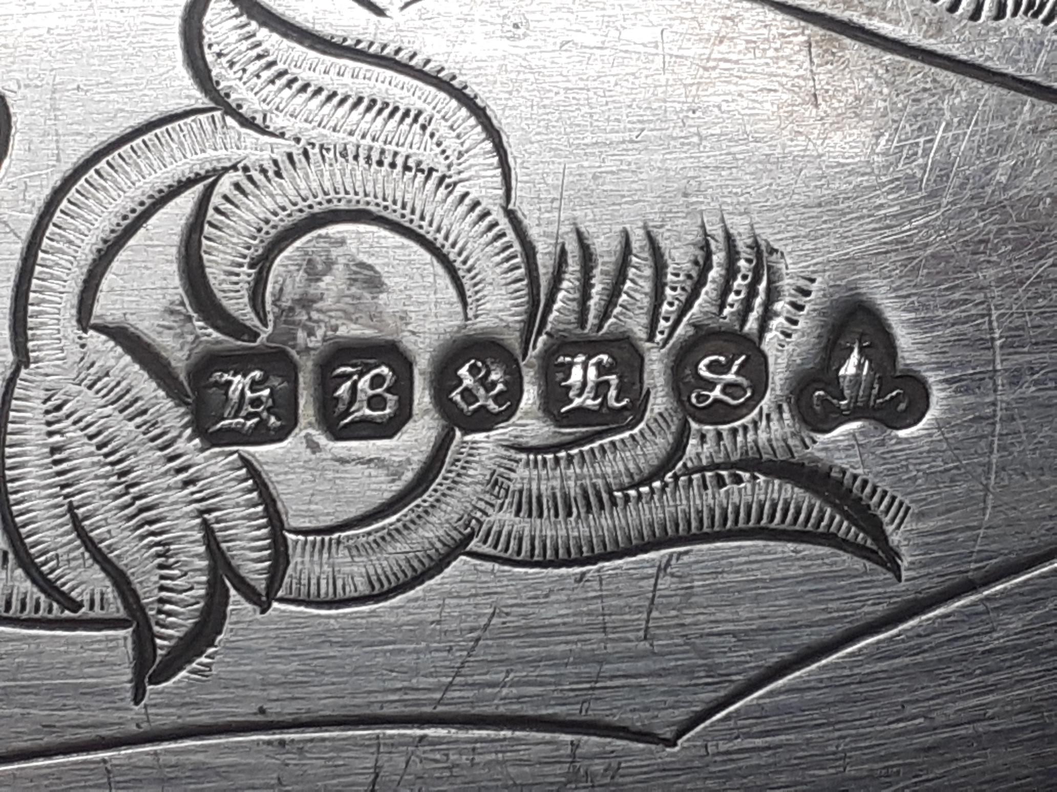 This is a British-made piece but it is not silver. The manufacturer’s mark reads HB&HS for Harrison Brothers & Howson of Sheffield. It is electroplated.