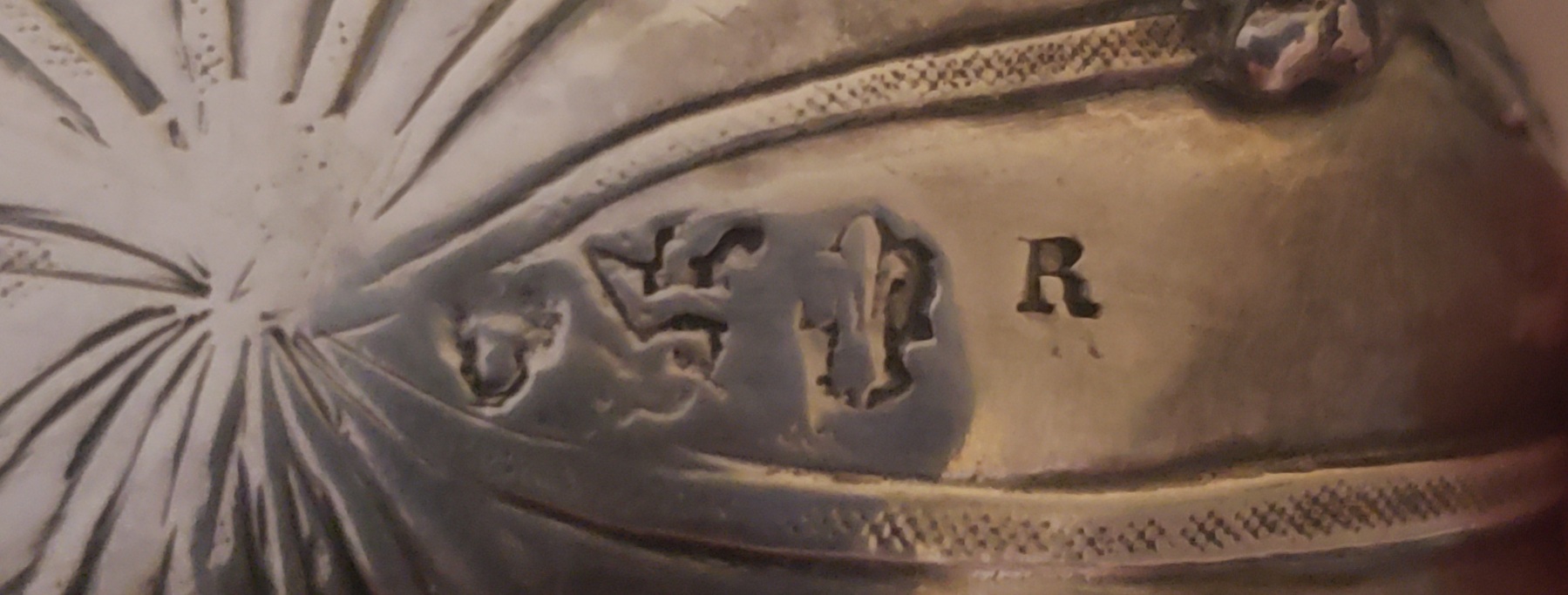 Your first picture shows a London sterling silver import mark for the assay year 1894/95 and the sponsor’s (importer’s) mark of Thomas Glaser. The second picture is of the original manufacturer’s mark. It seems typical of the sort of mark used by makers in Hanau, Germany, an important silver making area at the end of the 19th century. Unfortunately I am unable to identify the maker.