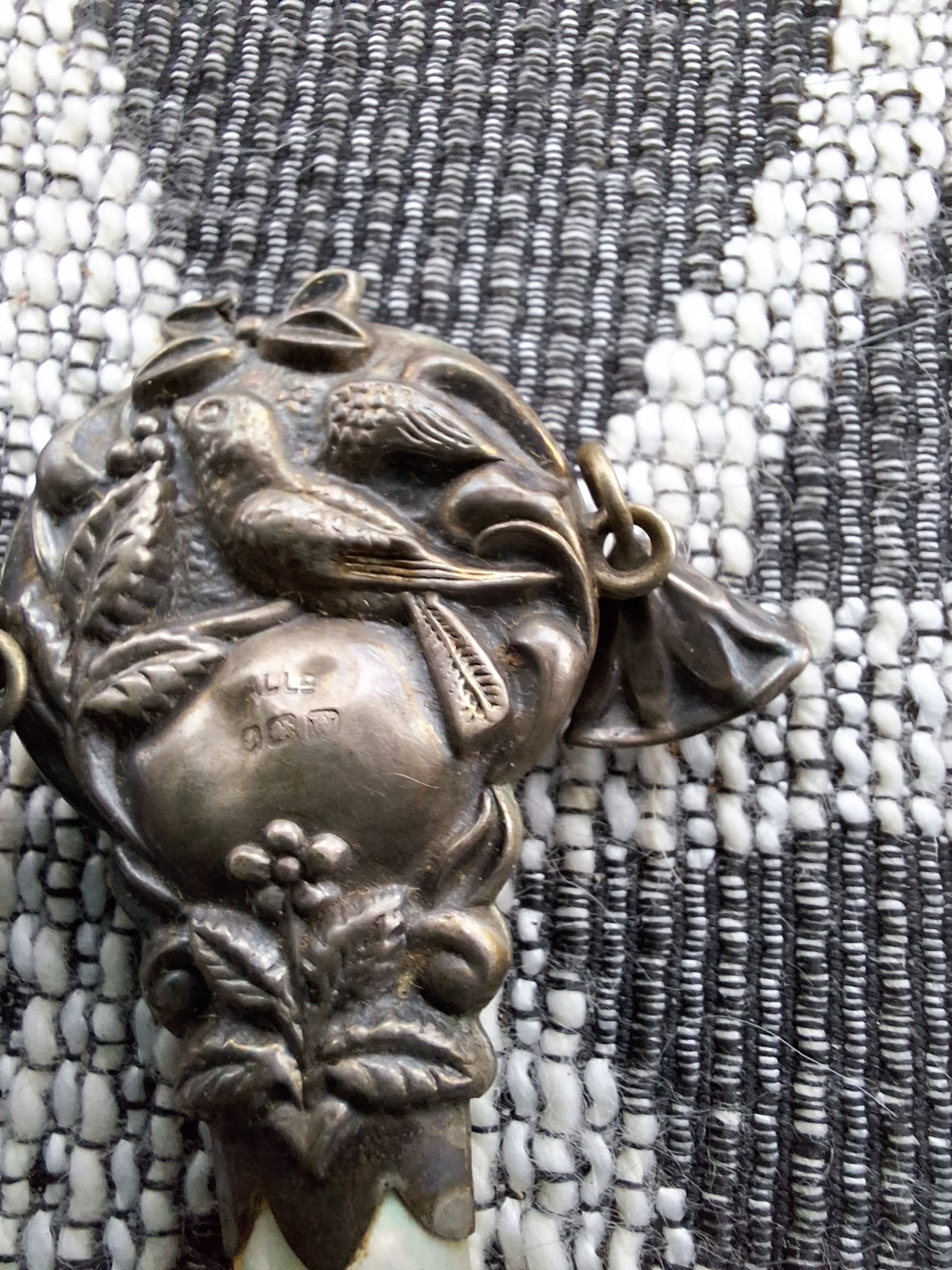 Your rattle has a Birmingham sterling silver hallmark with the date letter w for 1921. The makerâs mark is that of Adie & Lovekin Ltd. The character that you have read as an E is an underlined superscript D, LD being an abbreviation of Limited (Ltd).
