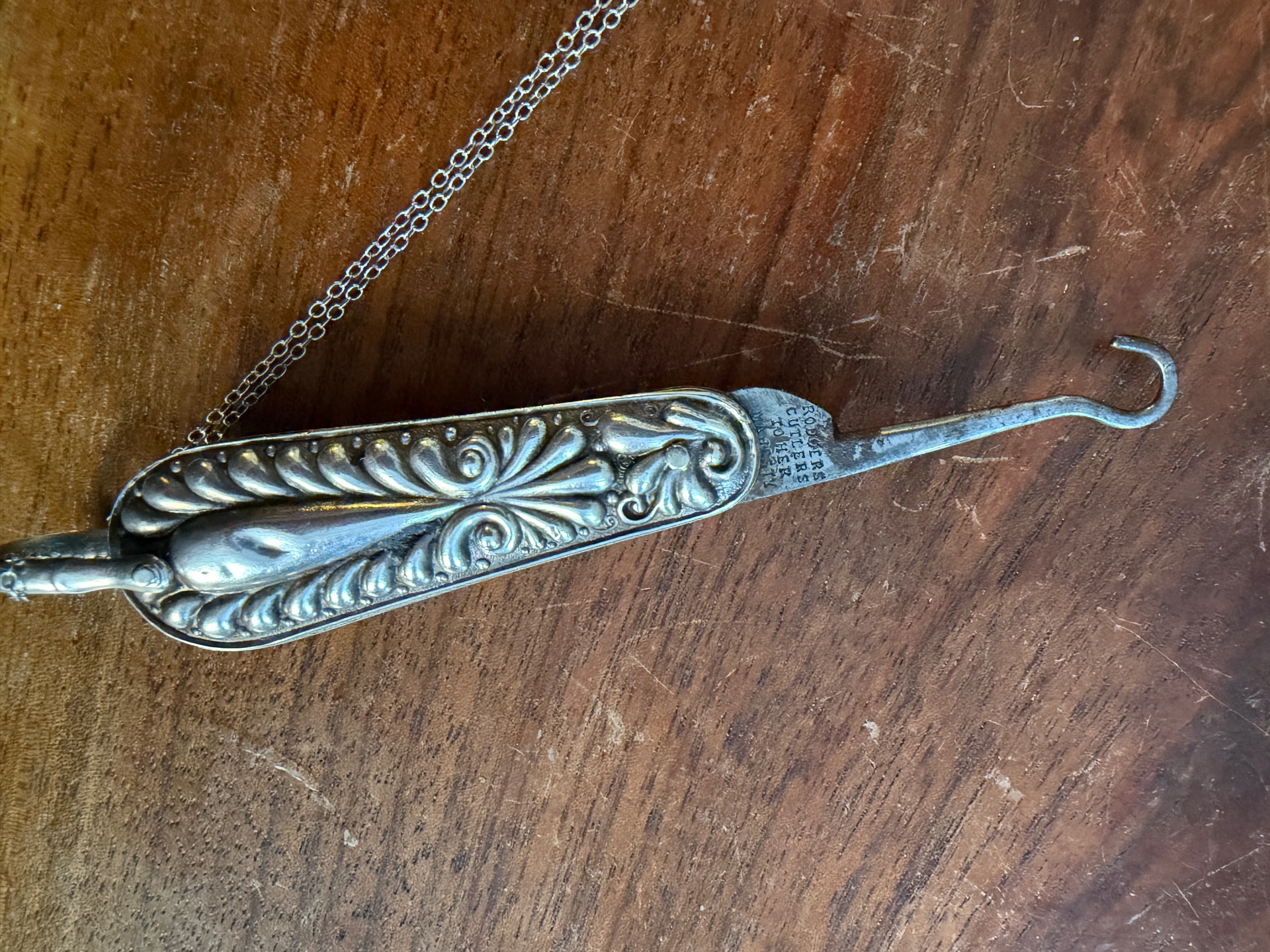 I have a sterling pocket hook that’s stamped Rodger’s Cutlers to Her Majesty and a Maltese cross and Star stamp. A little research says it’s likely a glove hook used to secure rows of buttons on gloves. Any other info anyone can provide appreciated! I polished a little but couldn’t get the rust(?) off the hook very well.