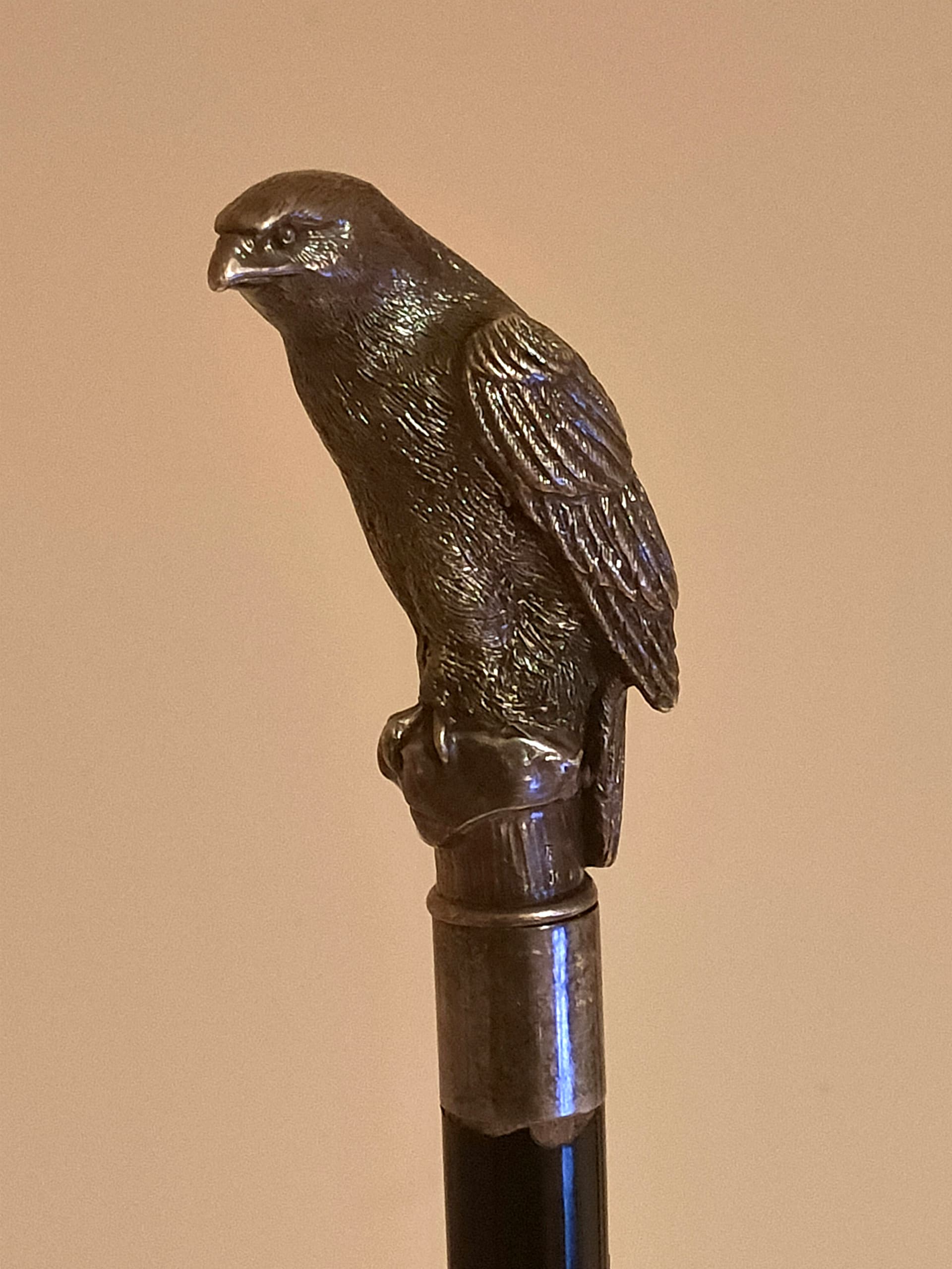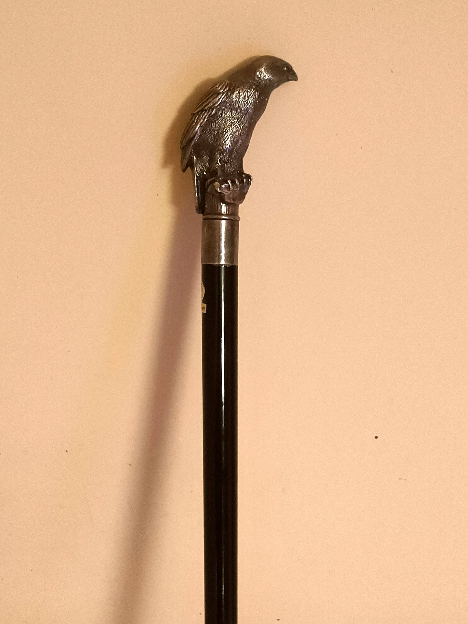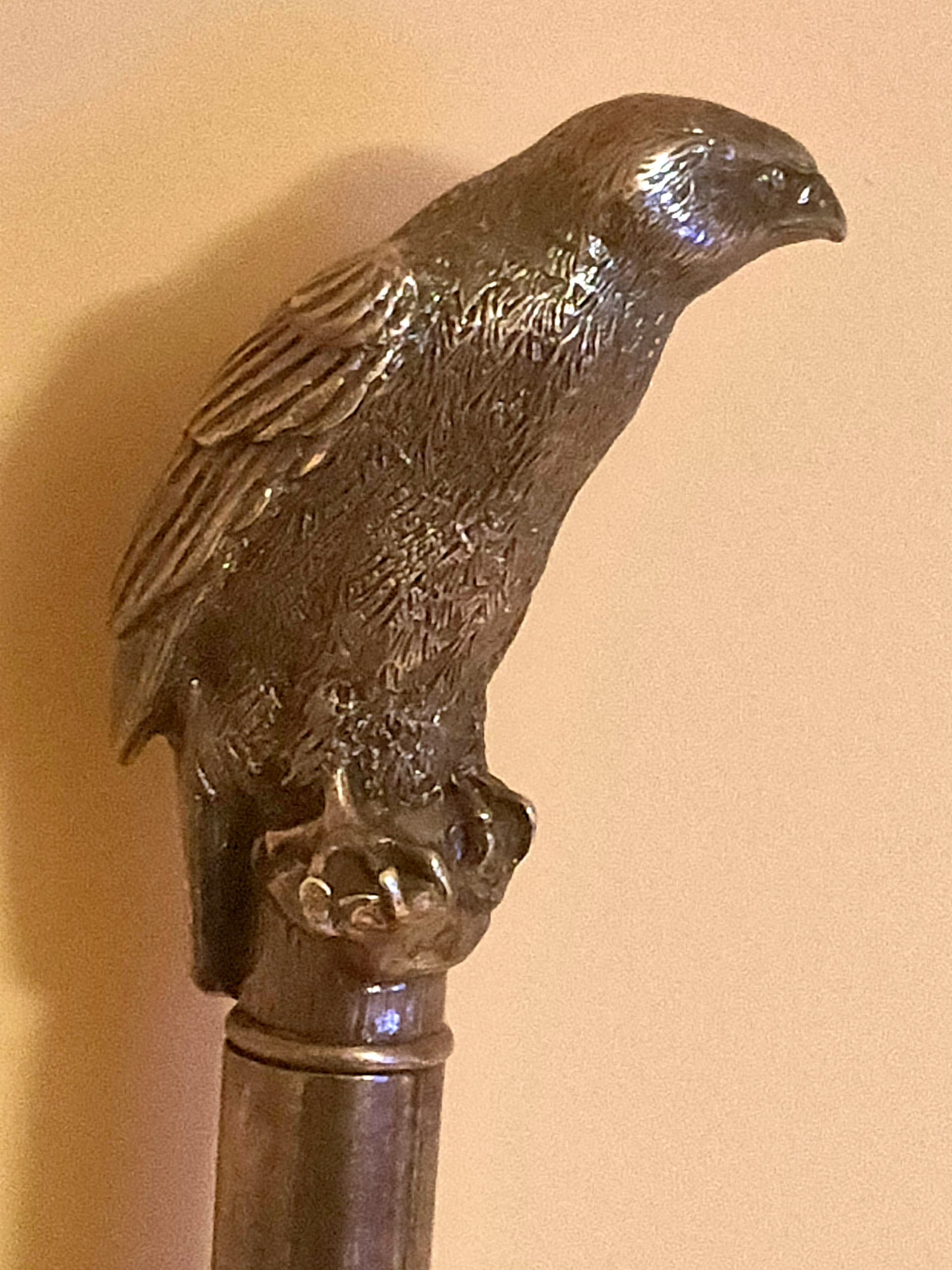 “This antique, beautiful, and rare walking stick features a 925 sterling silver handle in the shape of an eagle and a brass tip. The total length of the cane is 99 cm. The head is 10 cm long. Continental Europe, mid-20th century. The bird is beautifully and detailedly depicted, and the handle is comfortable. Hallmarked 925 sterling silver, this is in good condition. This collectible is a unique and extremely rare item.”