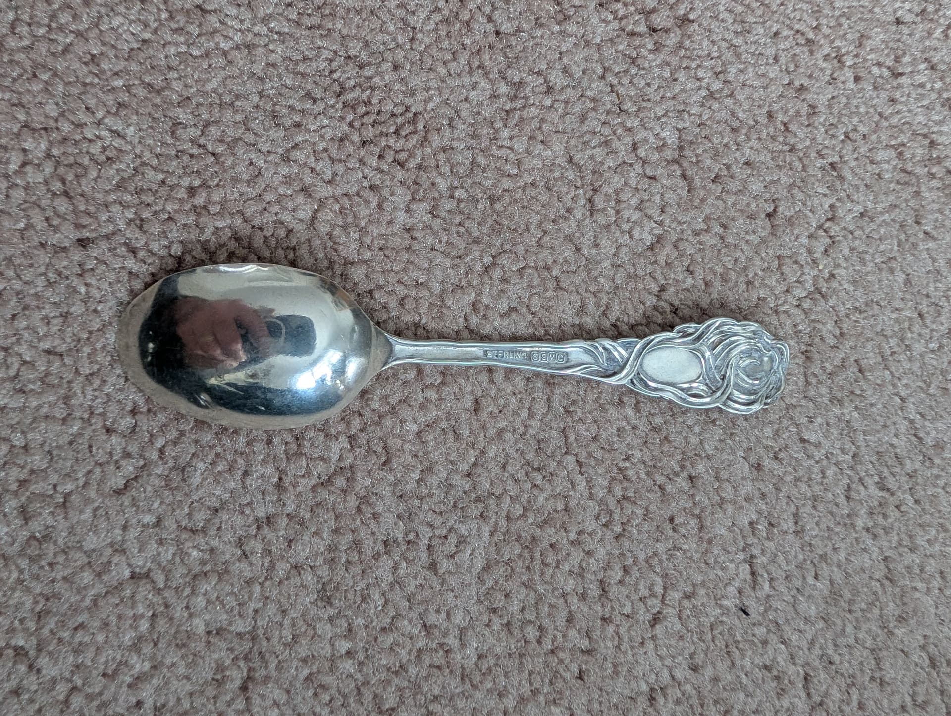 I think it’s a souvenir spoon from My Old Kentucky Home state park in Kentucky and probably sold at the gift shop in Federal HIll, the old plantation mansion in the park that served as the possible inspiration for the Stephen Foster song. The date range you suggest seems right, and the style is pretty typical of souvenir spoons of the era. It’s probably fairly rare though I doubt that adds very much to the value and probably only to souvenir spoon collectors, or Stephen Foster collectors. It’s pretty cool though, and I love how it’s jammed with detail.