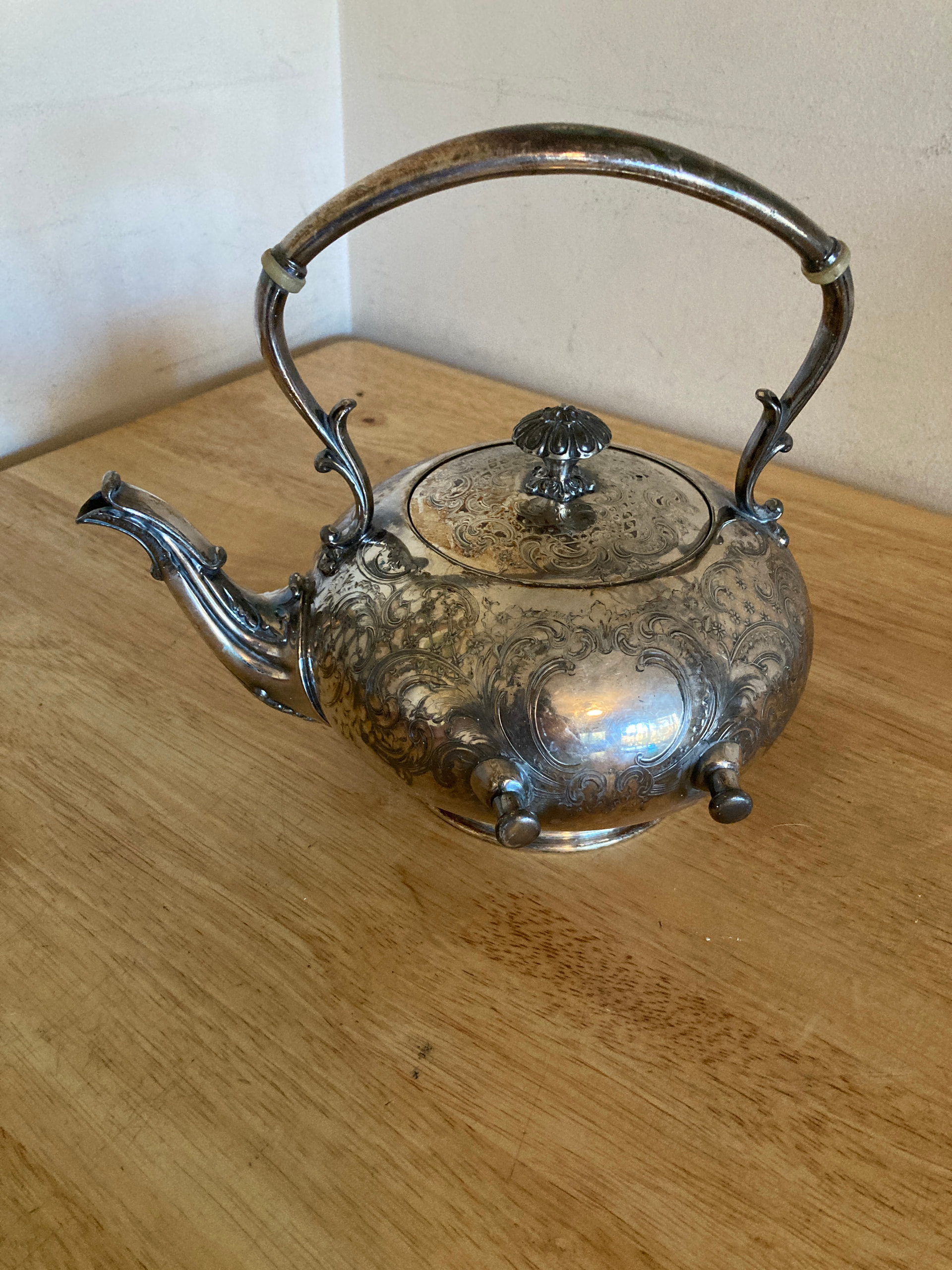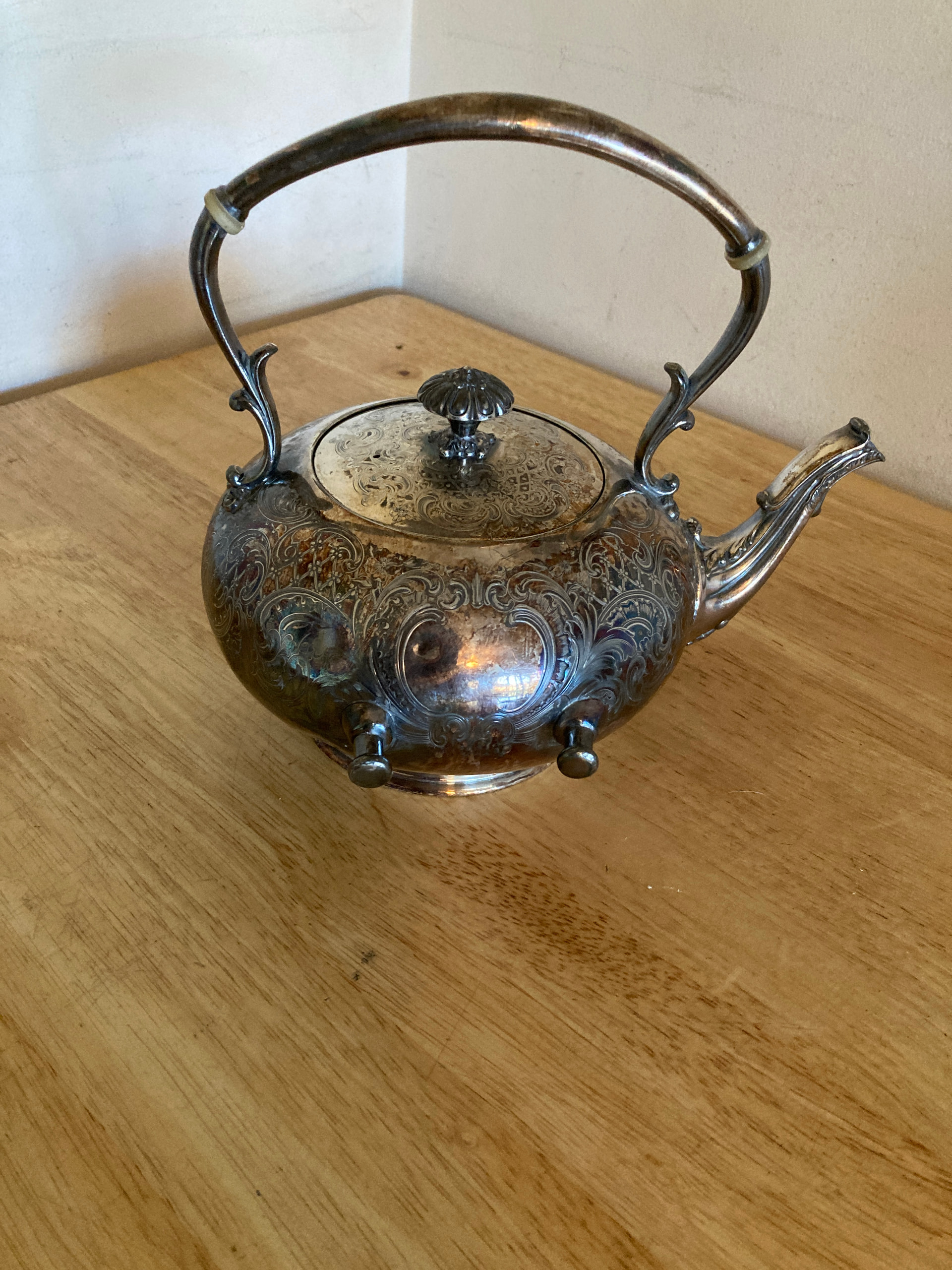It’s a last quarter 19th century silver plate on copper spirit kettle. Somehow separated from its stand and burner. Hundreds of them were made this one by a large-ish US manufacturer. The number 125 is a pattern number for the works. You can see the copper showing through around the circle round the standing lion. That is probably a thin application of copper over a brass base metal. It seems to have a dent in it but otherwise in good shape. It’s very similar to a Reed and Barton spirit kettle I had once but a different maker who used a standing lion in a circle as a trade mark which doesn’t show up on a quick search. The stand and burner will likely have the name of the maker and full trade mark on it.
