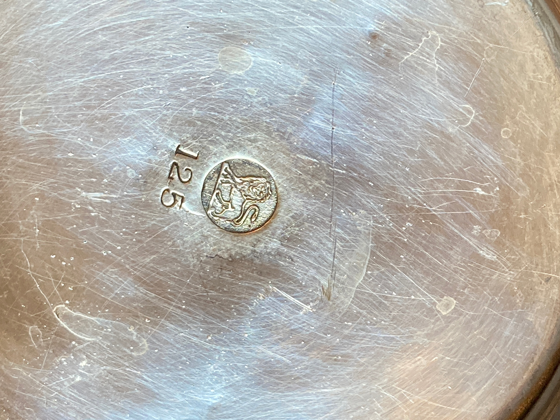 I have this teapot that was in my family and there is a standing lion as one of the marks and also a 125 on the bottom of the teapot. No other marks. I know that in many cases the standing lion means its sterling silver and British, but in my research I’ve learned there’s usually more symbols indicating maker, etc. I did read that the 125 could mean that it’s silver plate. But I’m hoping someone can help me identify if this is silver plate, silver and where is was made. Thanks in advance. Jessica