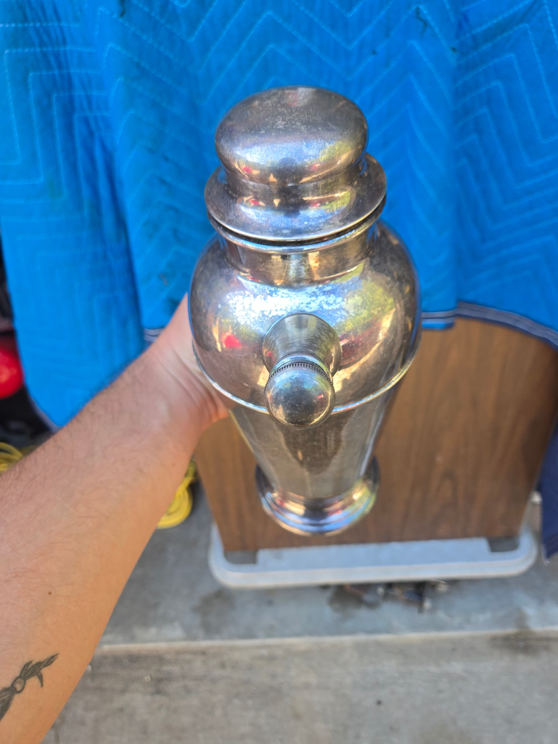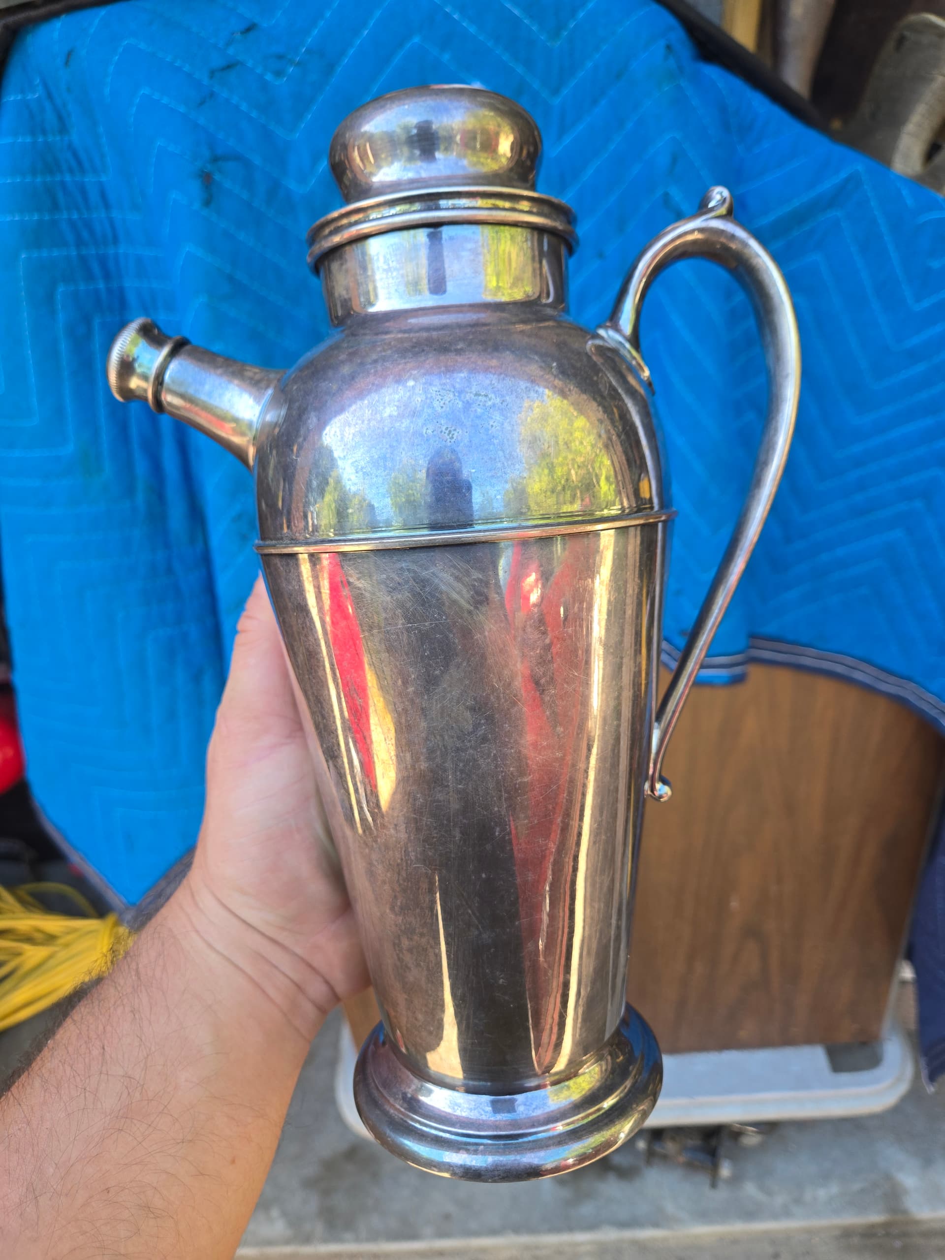 This is a Crescent Silverware Manufacturing silver-plated cocktail shaker. Note the marks do not indicate a town, a maker or a time of manufacture which would be expected to appear if it was sterling made in China. Instead it shows the three Crescent marks: the dragon followed by a C and then a picture of a cock tail.