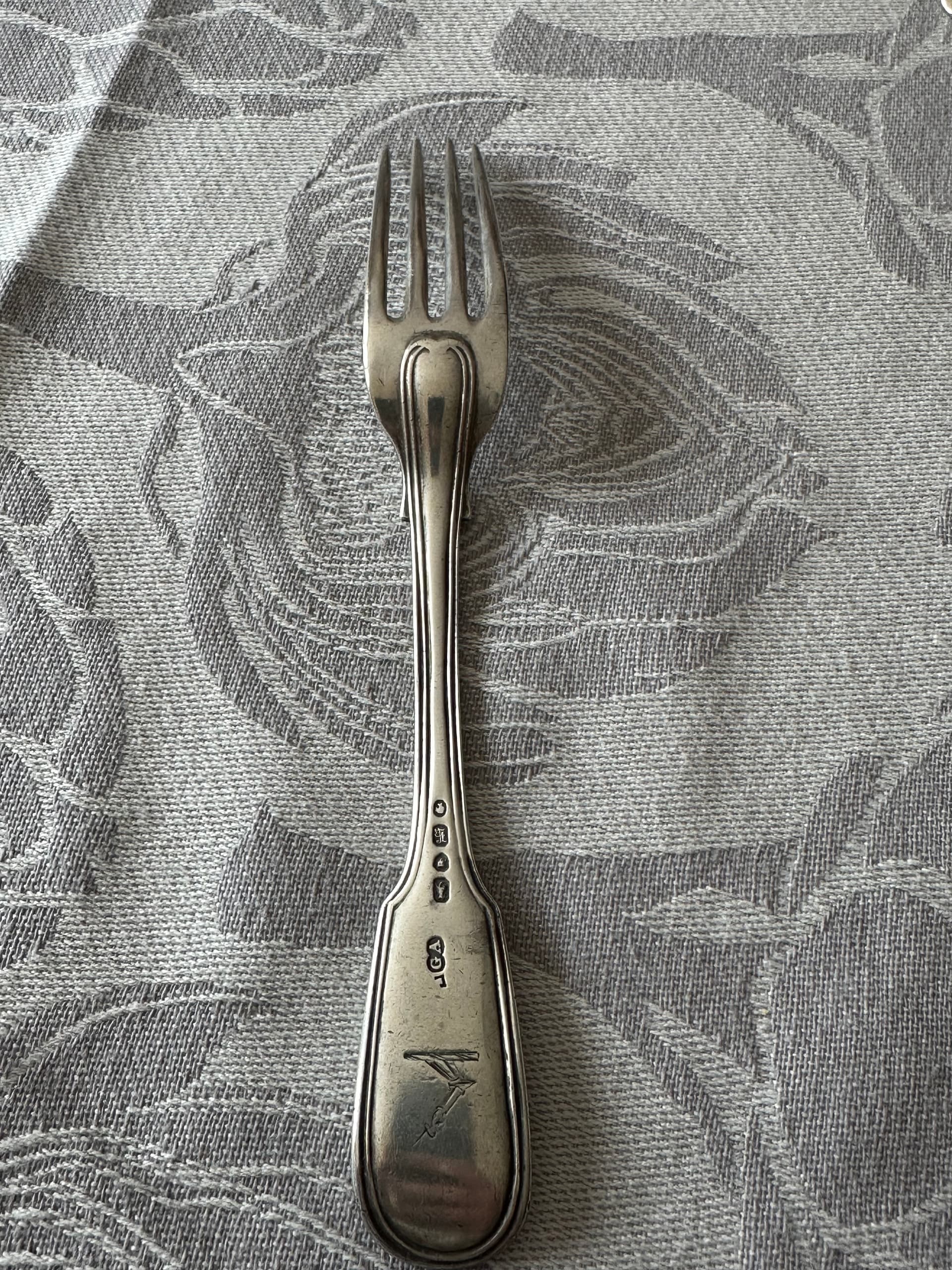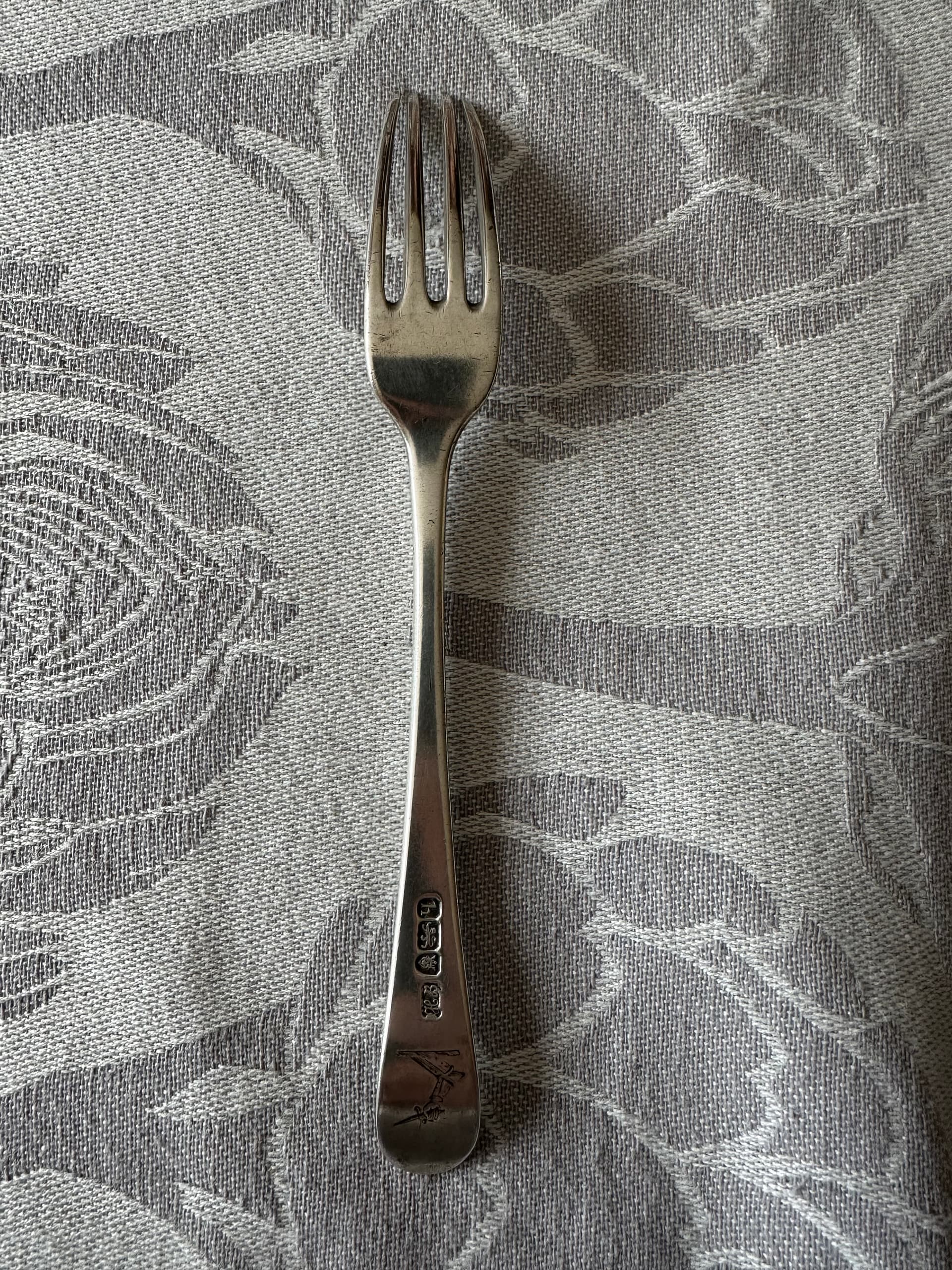 The hallmark on the plain-handled fork is London, 1783.