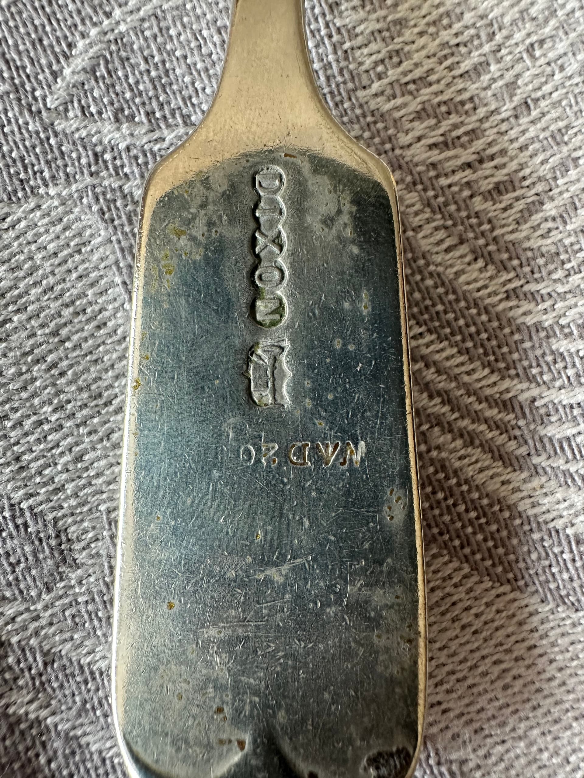 ETA: Those markings are particularly puzzling. They’re on the top surface of the handle, rather than the underside. That’s usually where a piece might be marked with something like the name of a hotel, railroad, or passenger ship. But these markings are rather crude, as if they’d been gouged out by hand. Very odd, indeed.