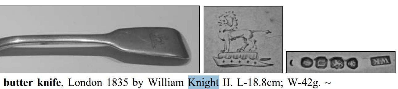 William Knight II entered his first mark as small worker, in partnership with his brother Samuel in 1810, the second as plate worker in 1816. and the third in two sizes in 1830. His fourth and final mark was entered the following year.