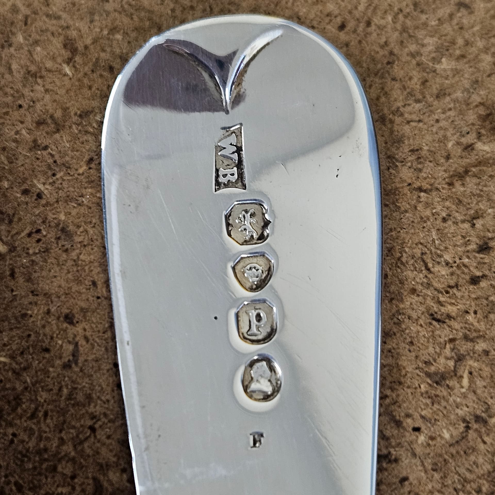 This WB is William Bateman II, son of William Bateman I, and the date letter p (lower case) is 1830/31. We can be sure of that because of the uncrowned leopard’s head which was introduced in 1821. The F is a journeyman’s mark, the private mark of the workman actually responsible for the piece, applied so that he would be paid for his work.