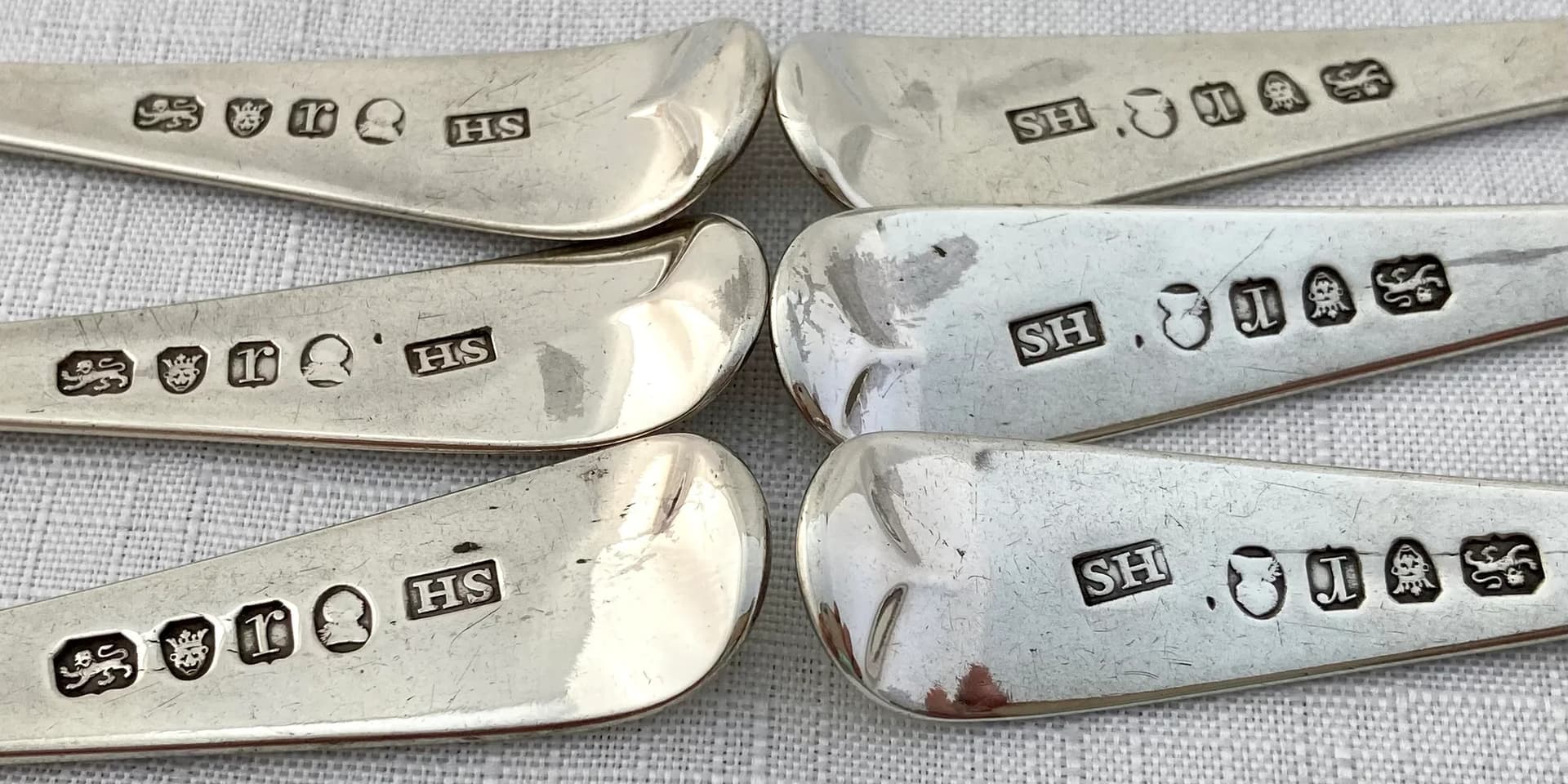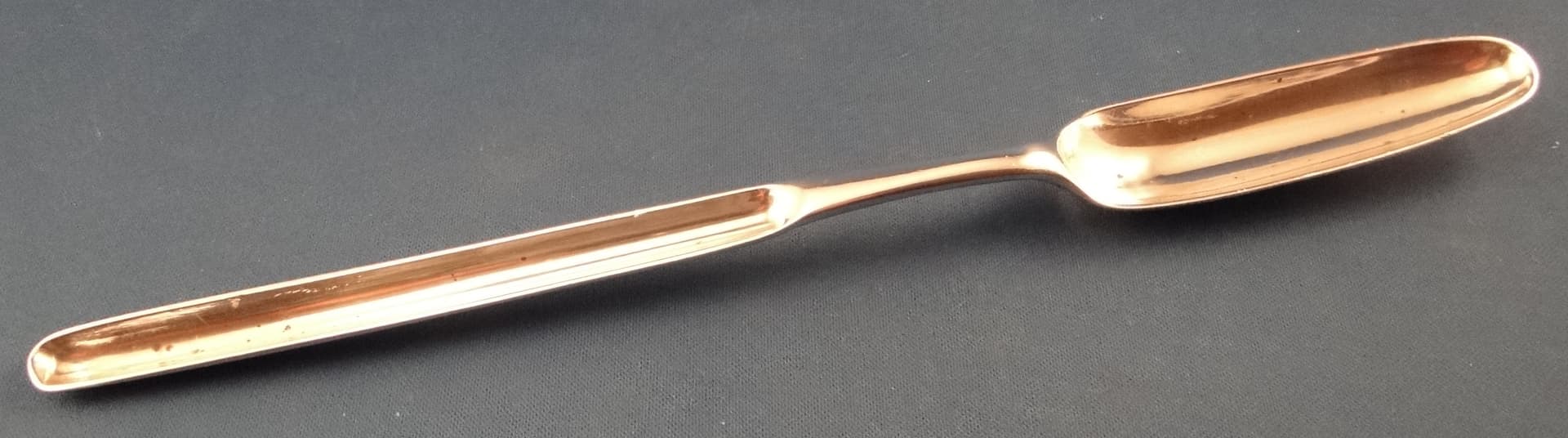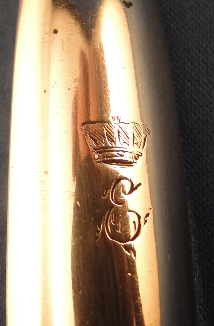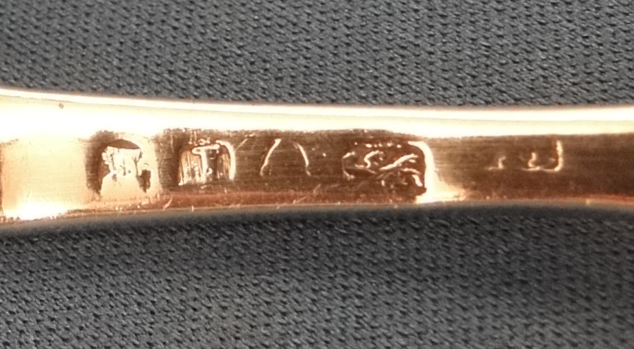 Hello all. After your success with the William Young makers mark I have another puzzle for you. This one is also on a marrow scoop (but a different one). I think that the hallmarks identify it for Solomon Hougham in London in 1792, but it’s the monogram, an E with a crown over it, that I can’t track. I’m not convinced that it’s an English crown, but I don’t know. What do you think? And what is its significance?